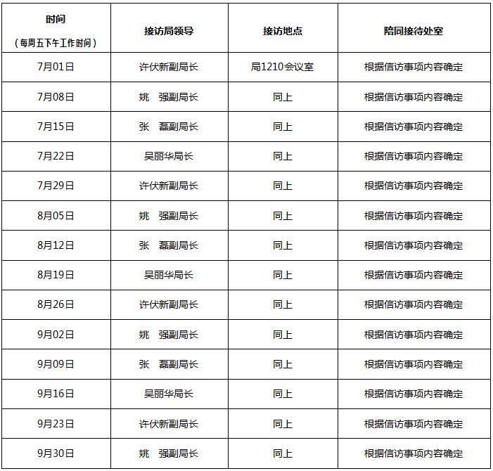 为提高信访接待质量,来访人应事先联系并提交相关信访资料,经审核确需现场接访的,安排局领导及相关处室陪同接访;如属一般性信访事项或投诉咨询,经来访人同意,可按一般程序直接交相关职能处室办理。局领导工作分工详见AG真人网站“AG真人娱乐娱乐”栏目。